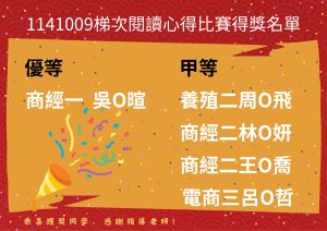 1141009梯次全國高級中等學校閱讀心得比賽得獎名單Post author:圖書館主任Post published:2025-11-18Post category:003.校務訊息 / 07.圖書館恭喜獲獎同學,感謝指導老師! Post Views: 130相關內容國立臺南海事110學年度第2學期第1次校務會議資料-11102102022-02-09國立臺南海事110學年度第2學期第2次校務封面與會議紀錄11106302022-07-07國立臺南高級海事水產職業學校112年度專案計畫運動教練甄選簡章(第一次)2022-12-30