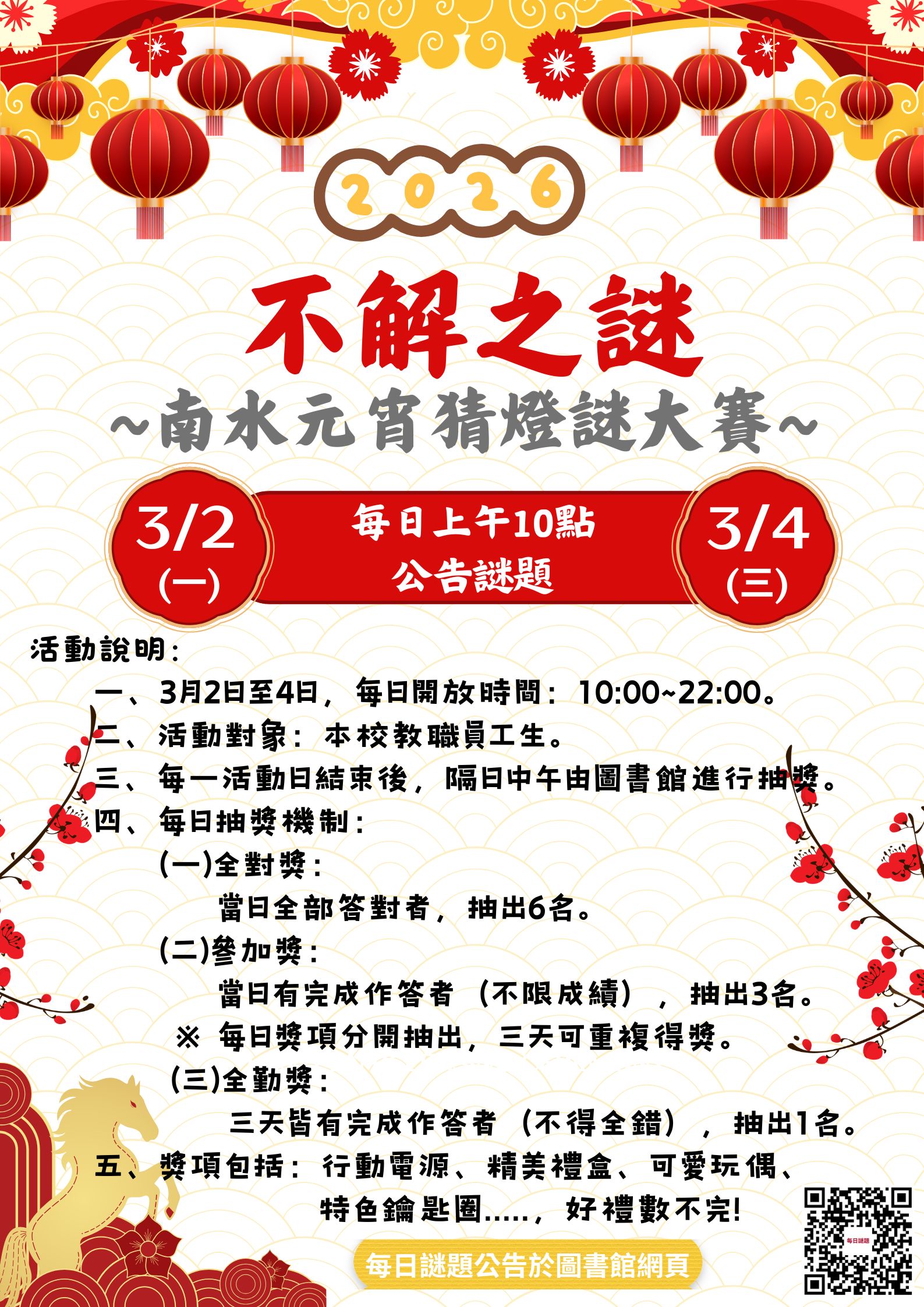 2026「不解之謎」南水元宵猜燈謎大賽~DAY3~Post author:圖書館主任Post published:2026-03-04Post category:005.學生賽事 / 07.圖書館3月4日 第三天~https://reurl.cc/MMn81L Post Views: 36相關內容轉知國立臺灣體育運動大學辦理「地方籃球需要你3×3籃球賽」2021-09-27狂賀本校射箭隊參加112年全國中等學校運動會榮獲佳績2023-05-31中國醫藥大學第四屆全國中醫藥書法比賽2025-03-05