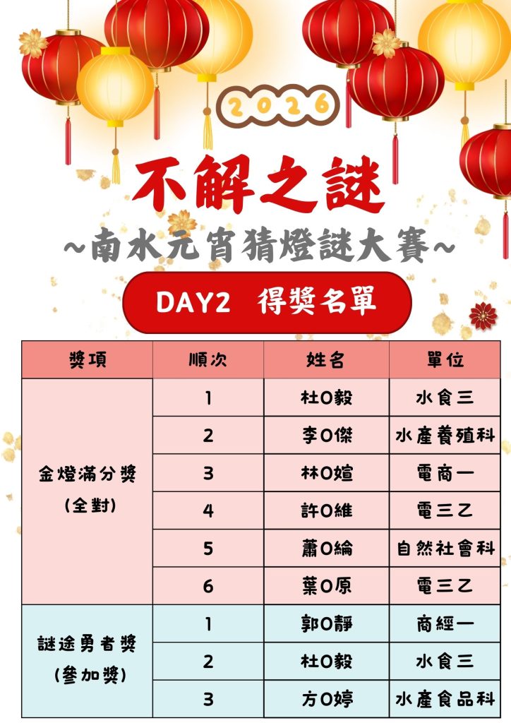 2026「不解之謎」南水元宵猜燈謎活動~DAY 2~得獎名單Post author:圖書館主任Post published:2026-03-04Post category:005.學生賽事 / 07.圖書館恭喜以上獲獎的挑戰者,請至圖書館領獎~ Post Views: 39相關內容賀!1120315梯次小論文比賽獲獎名單2023-04-272024第五屆臺灣中小學中文能力檢定考試」(Taiwan Chinese Test , TCT)測驗資訊2024-03-01114學年度「全國技術型高級中等學校學生職場英語演講比賽試辦實施計畫」2025-07-10