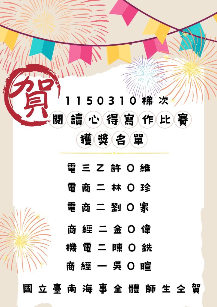 賀!!!本校1150310梯次閱讀心得寫作比賽獲獎名單Post author:圖書館主任Post published:2026-04-16Post category:003.校務訊息 / 07.圖書館 Post Views: 34相關內容111學年度第2學期學雜費、代收代付費及代收代辦費收費公告2023-01-30國立臺南高級海事水產職業學校114年度第2次圖書建議報廢清單2025-06-27行政院主計總處函釋關於政府機關員工參加升官等(升資)考試之旅費補助事宜2026-01-01