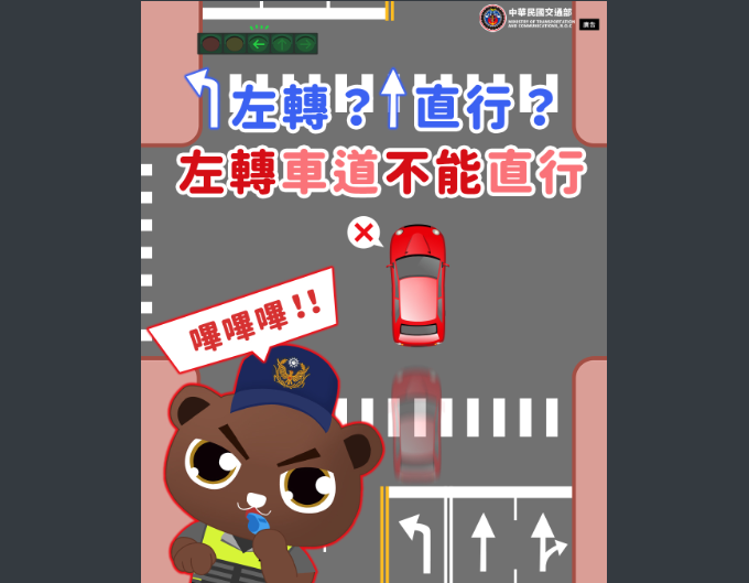左轉專用車道僅供左轉車輛使用,若左轉專用車道前方設有左彎待轉區,直行及右轉箭頭綠燈亮起時左轉車應駛入待轉區等候,不僅縮短通過距離,左轉車道也可容納更多車輛,增進路口運轉效率喔!