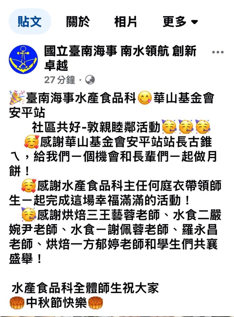 水產食品科&烘焙食品科最新消息本科簡介師資陣容課程規劃教學設備 榮譽榜 升學資訊活動剪影活動剪影海事師生與社區敦親睦鄰中秋節月餅(100份)活動照片均質化-海味蛋糕製作研習水產食品科 成果展業師融入教學優質化-魚丸製作條件探討烘焙食品科 成果展職場體驗-烏魚子觀光工廠中秋禮盒製作中秋禮盒製作